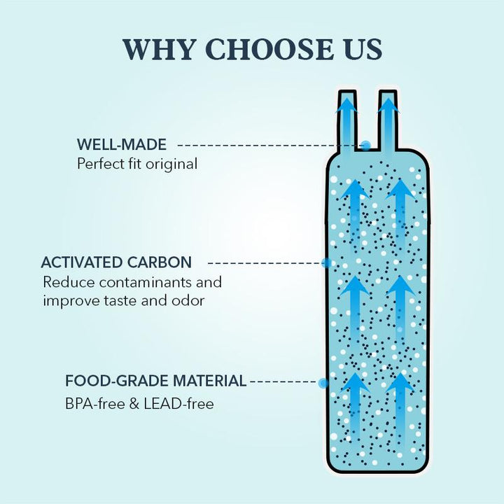 BPA-Free and food-grade materials, Sri Lankan coconut shell carbon block, super adsorption capacity, maximum reduction of harmful impurities contained in drinking water, while retaining beneficial minerals to the human body, significantly improved the taste of water.